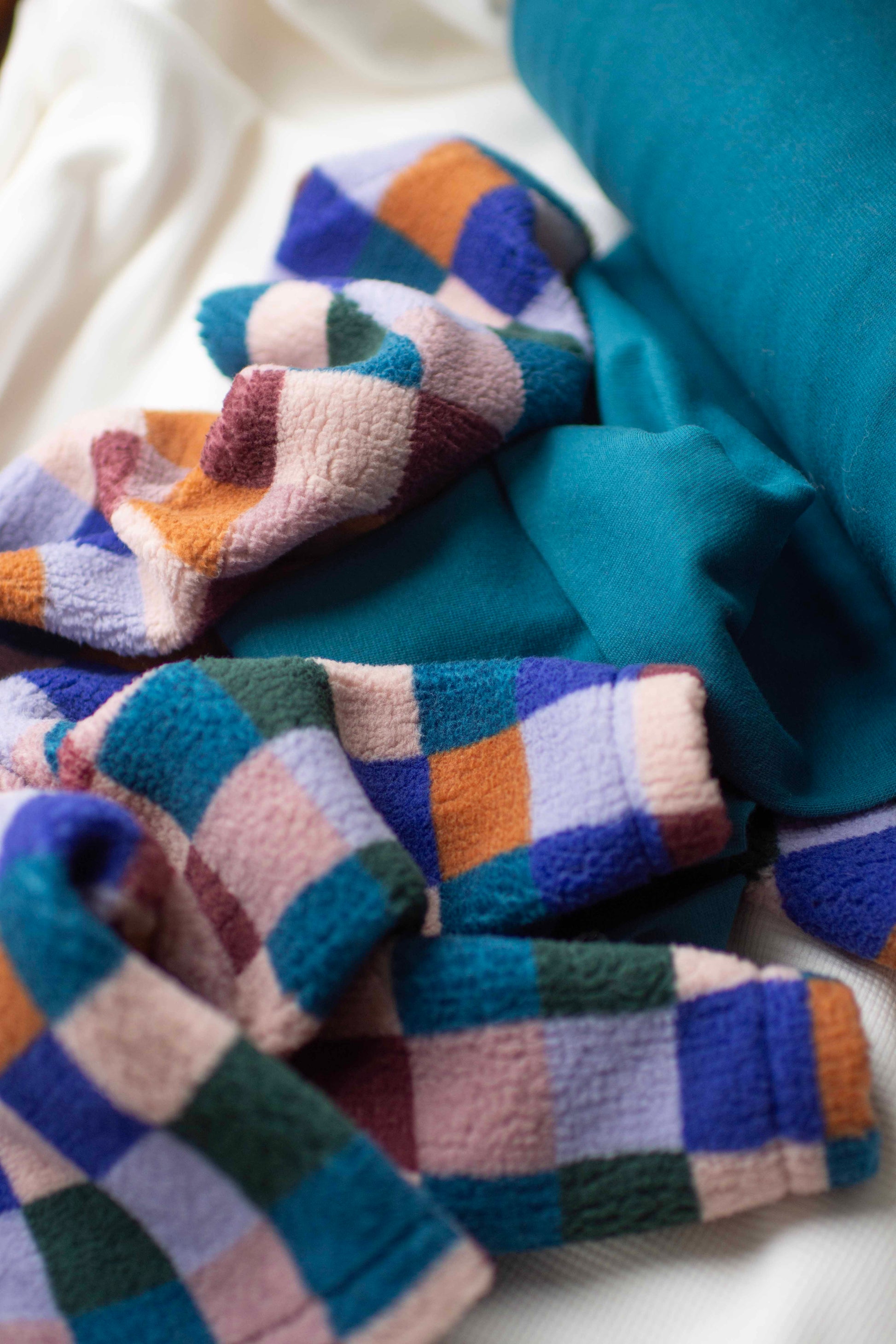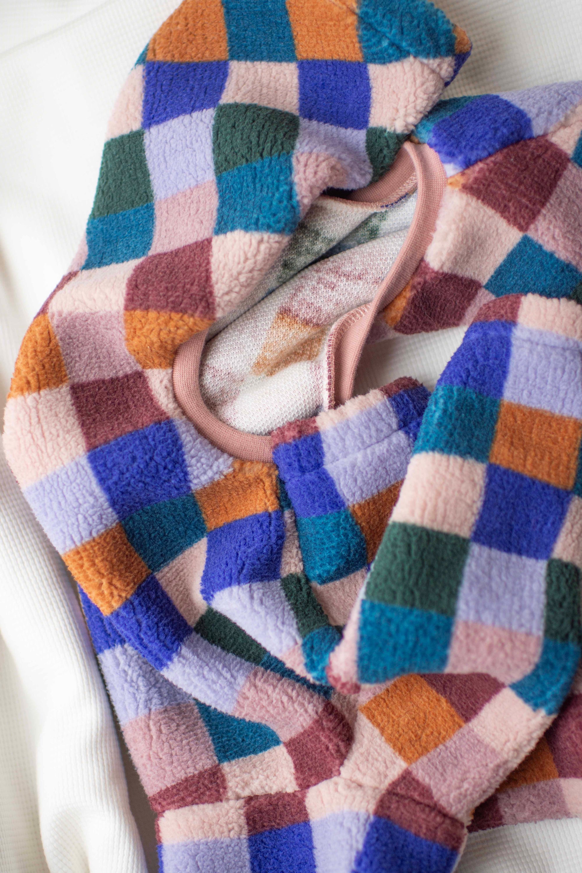 The ultimate squishy, thick teddy sherpa fleece fabric in a super cool check print. Just choose your colour ribbing between a dusty light pink or a warm teal.